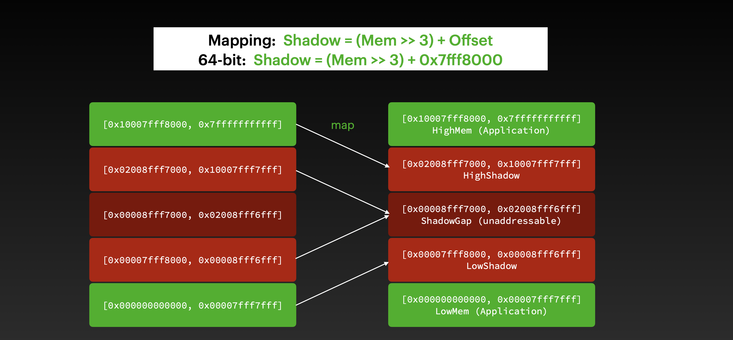 更细一点来说,内存地址会分配 5 部分,最上和最下 (HighMem & LowMem) 都是应用内存区,他们会映射到 HighShadow 和 LowShadow 上,HighShadow 和 LowShadow 之间是 ShadowGap 区域,ShadowGap 区域是不可访问的,如果访问到会直接 crash.